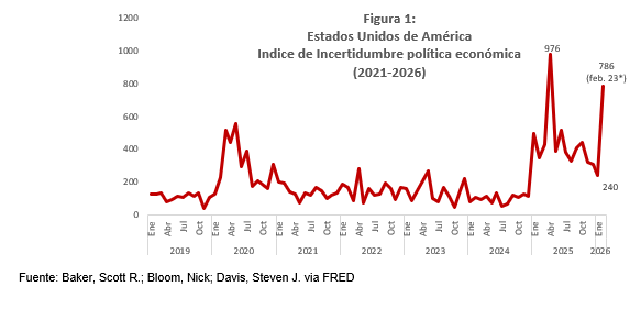 El aumento en la incertidumbre se debe, en gran medida, a tres factores: 1) La intensificación de los riesgos geopolíticos en lugares como Irán, Venezuela y Groenlandia; 2) el impacto en la política  comercial de EE.UU. de la decisión de la Suprema Corte de Justicia de declarar ilegales los aranceles impuestos por órdenes ejecutivas; y 3) Las renovadas presiones de la Administración Trump sobre la Reserva Federal (FED) en un momento de importantes cambios en su plana gerencial, lo que causa preocupación sobre el futuro de la política monetaria estadounidense. Veamos.