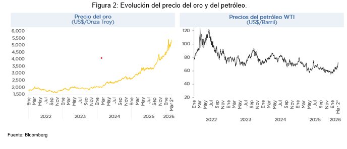 Según el Fondo Monetario Internacional (FMI), la economía mundial crecería alrededor de 3.3% en 2026, impulsada principalmente por una mayor expansión de las economías avanzadas. Sin embargo, este escenario enfrenta significativos riesgos a la baja ante el recrudecimiento de la incertidumbre mundial. En efecto, el índice de incertidumbre de política económica de EE.UU., que había mostrado una moderación en la segunda parte de 2025, ha repuntado nuevamente (Figura 1).