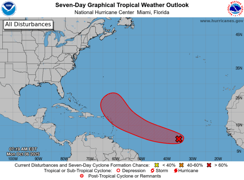 Panorama Nacional. -El Instituto Dominicano de Meteorología (Indomet) informó este lunes que mantiene vigilancia sobre una zona de baja presión ubicada a varios cientos de kilómetros al suroeste de las islas de Cabo Verde, con un 50 % de probabilidad de convertirse en ciclón tropical en los próximos dos días.