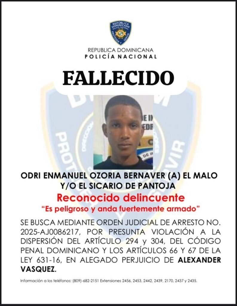Se trata de Enmanuel Ozoria, alias “El Malo” y/o “El Sicario de Pantoja”, mayor de edad, quien falleció mientras recibía atenciones médicas en el hospital Dr. Vinicio Calventi, a consecuencia de múltiples heridas de bala.