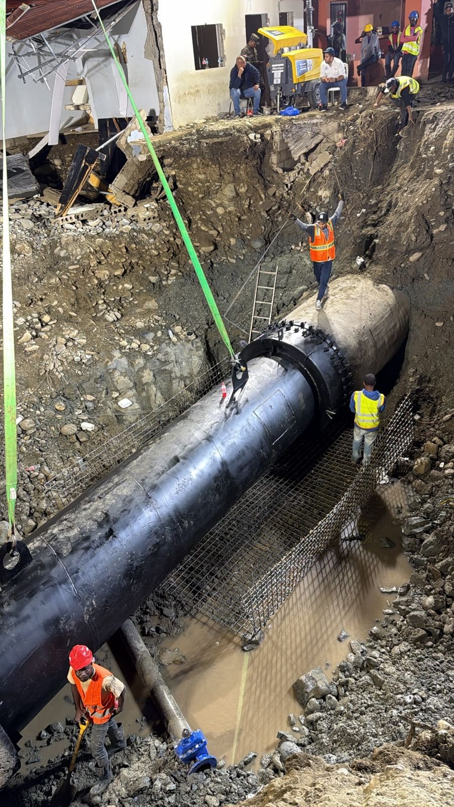 Los trabajos de reparación comenzaron el jueves al mediodía, cuando técnicos de Coraasan, Inapa y contratistas especializados evaluaron los daños y planificaron la intervención. La tubería afectada es clave para garantizar agua potable a una amplia región, lo que hizo urgente restablecer el servicio.