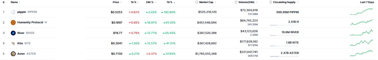 Entre los desempeños más destacados se encuentran pippin (PIPPIN), humanity protocol (H) y river (RIVER), con subidas del 192%, 61% y 55%, respectivamente.