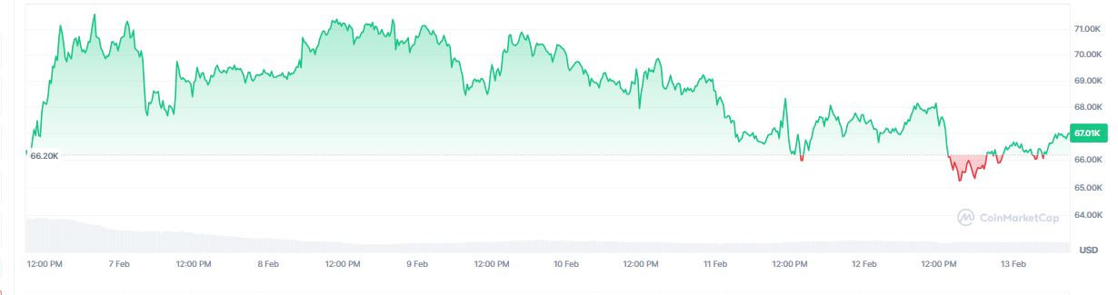 En los últimos siete días, el precio de bitcoin tuvo un incremento del 1,2% desde los 66.200 dólares. Al momento de esta publicación, tal como puede verse en la Calculadora de Precios de Criptonoticias, cotiza a 66.971 dólares.
